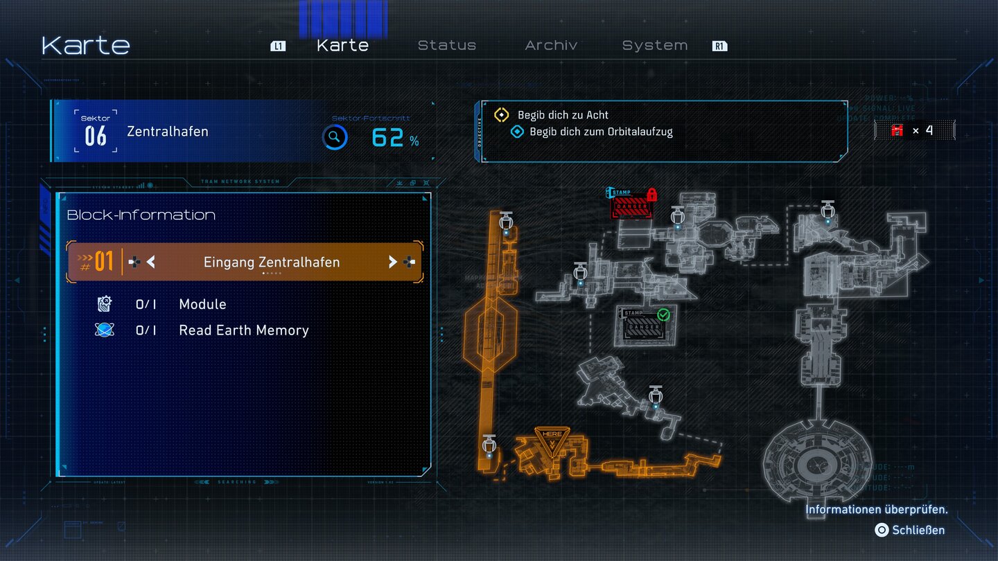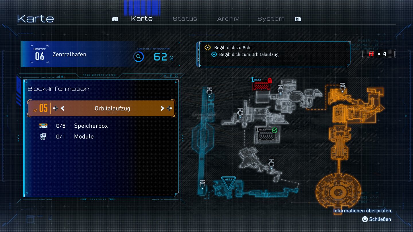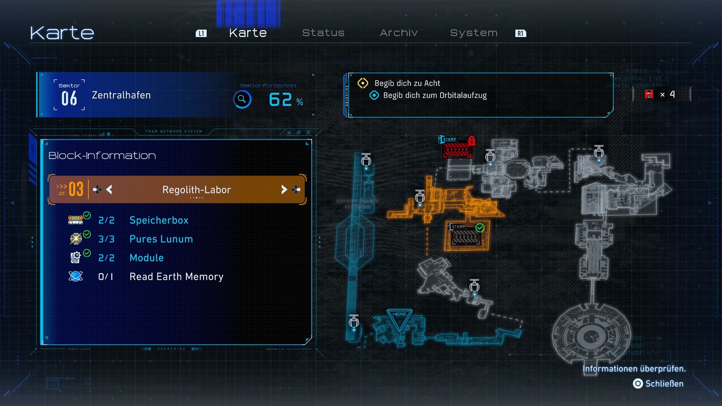 Springt nach der Schutzraum-Luke nicht den blauen Vorsprung runter. Klettert stattdessen über die blaue Röhre und folgt dem Weg durch die Tür hinter den Trümmern. Geht die Treppe hinunter, wo das rote Geflecht die Wand hinunter wächst. Auf der Plattform findet ihr nicht nur einen gelben Upgrade-Würfel. Schaut etwas nach links oben und der letzte Cabin ruft euch schon zu.
