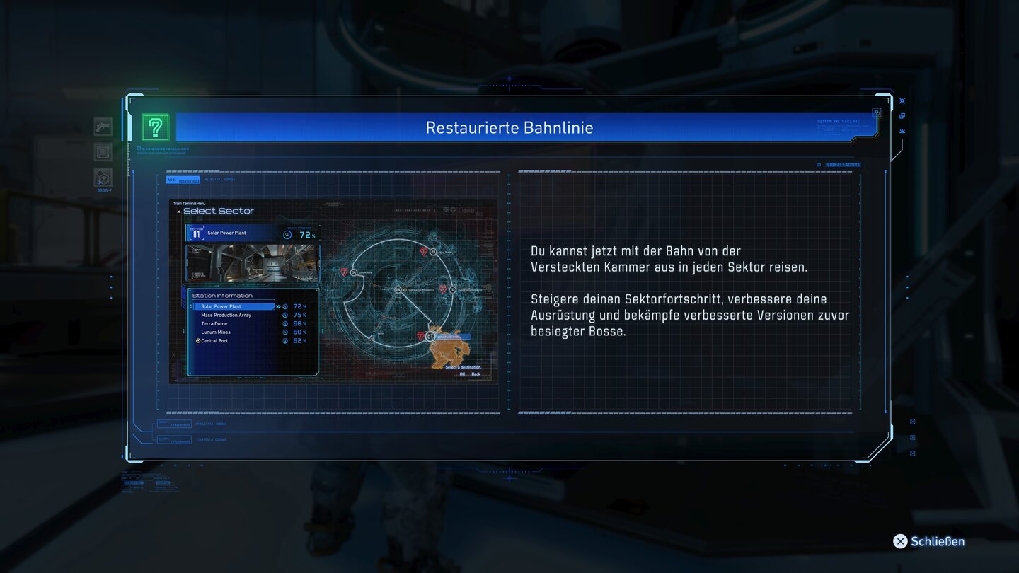 Habt ihr den Unknown Signal-Spielstand geladen, landet ihr zunächst wieder im Hub, von wo aus ihr mit der Bahn ins neue Areal namens Versteckte Kammer fahrt.