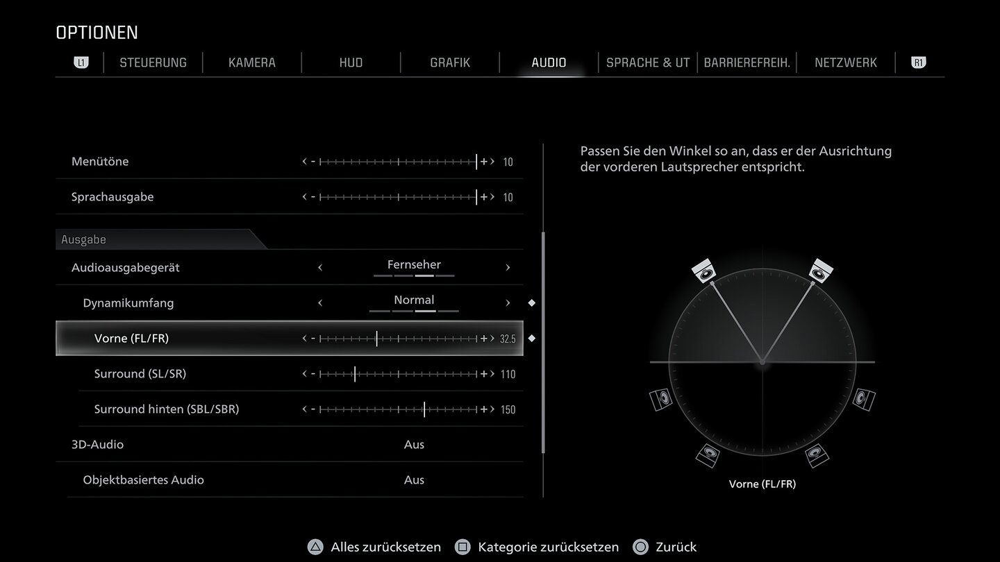 Zockt ihr hingegen über TV-Lautsprecher, dann solltet ihr euch für die entsprechende Option entscheiden und über den Vorne-Slider ungefähr festlegen, wo sich die beiden Boxen in Relation zu euch befinden. Bei einer Heimkino-Anlage solltet ihr die Winkel ebenfalls entsprechend der Platzierung der Lautsprecher anpassen.