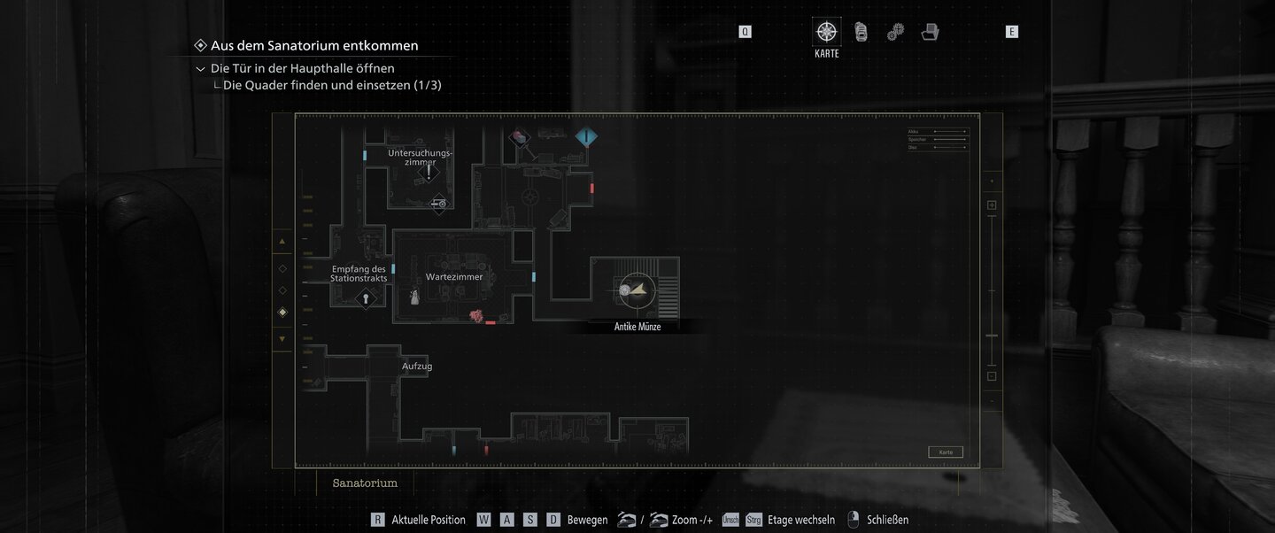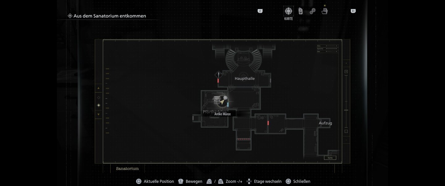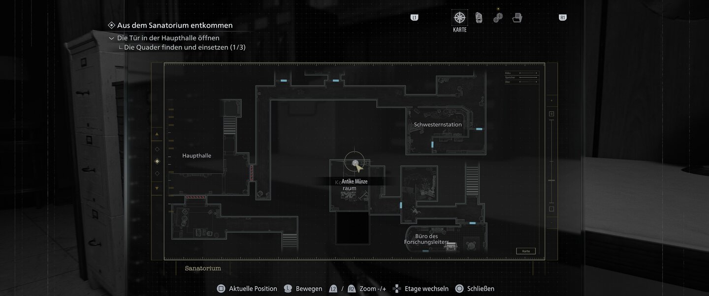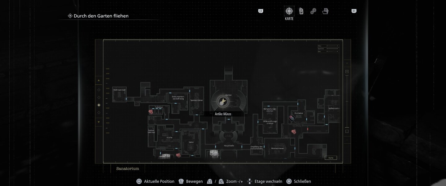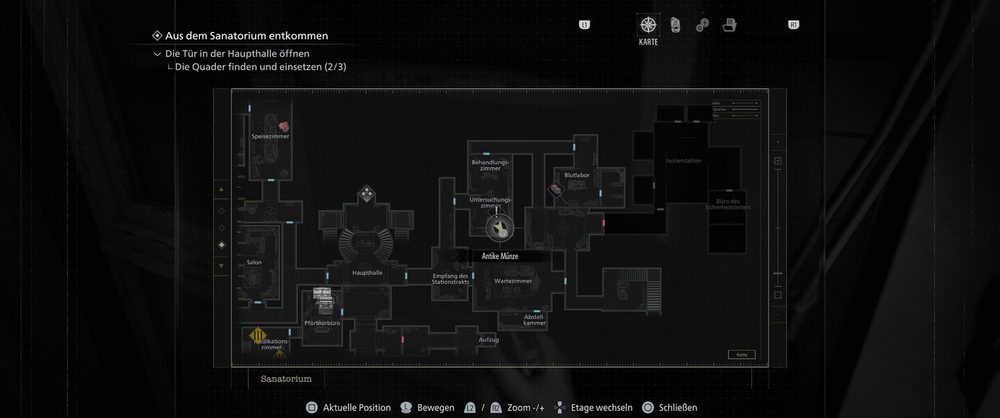 Zwei Dinge vorweg: Münzen findet und nutzt ihr nur als Grace im oberen Sanatorium. Wenn ihr Leon spielt oder später in anderen Arealen unterwegs seid, braucht ihr nicht mehr die Augen aufzuhalten. Das bedeutet auch, dass ihr alle Münzen im Sanatorium ausgeben solltet – ihr müsst sie nicht aufsparen.