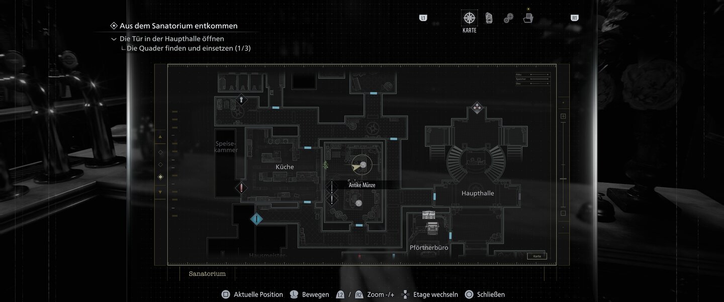 Die Schließfächer, an denen ihr die Münzen einsetzen könnt, findet ihr im Salon. Der liegt noch vor der Küche im Westflügel, allerdings benötigt ihr dafür den roten Stein.