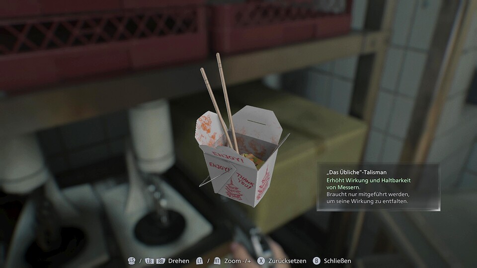 Dieses Item ist gemeint: Es geht um den "Das Übliche"-Talisman. Ihr müsst ihn lediglich in eurem Inventar haben, damit sich seine Wirkung entfaltet. Neben der Haltbarkeit erhöht der Talisman auch die Wirksamkeit von Messern.