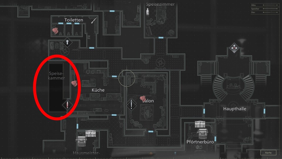 Es ist grundsätzlich recht einfach, am Talisman vorbeizulaufen und zu Beginn müsst ihr das auch ganz normal tun. Er befindet sich nämlich in der Speisekammer neben der Küche im Westflügel. Also dem Ort, an dem ihr dem grobschlächtigen Koch zum ersten Mal begegnet.