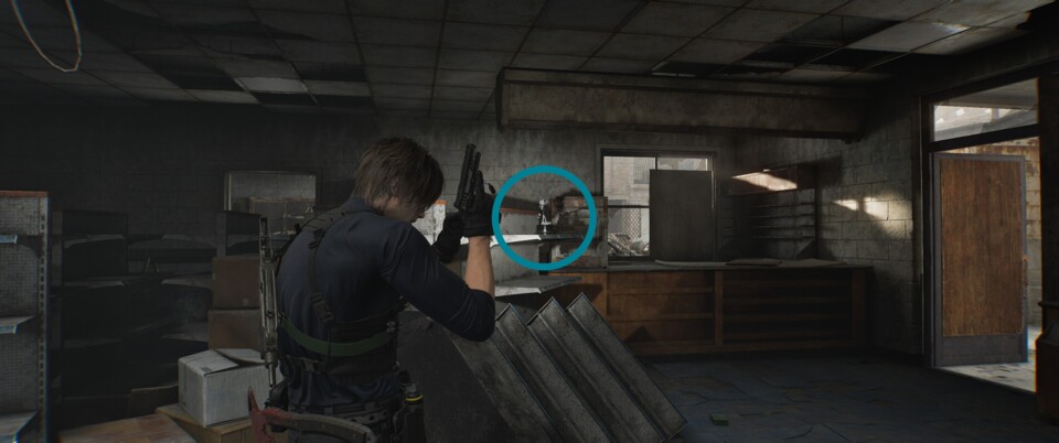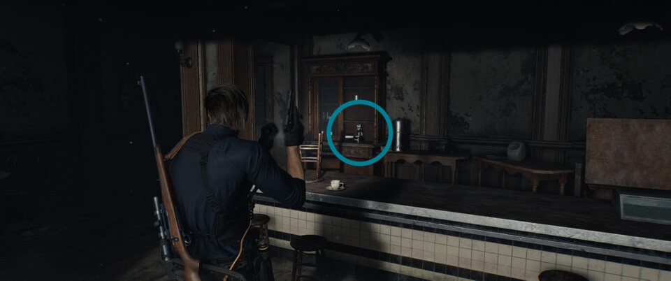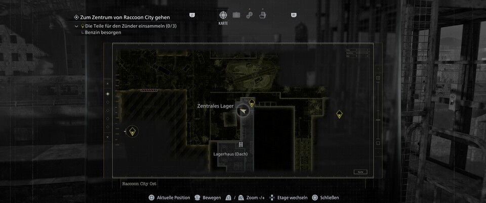 Dies dürfte der wohl schwierigste Raccoon sein. Während ihr Grace mit dem Scharfschützengewehr unterstützt, müsst ihr vom Dach aus nach einer Laterne Ausschau halten. Die Figur steht auf demselben Sockel.