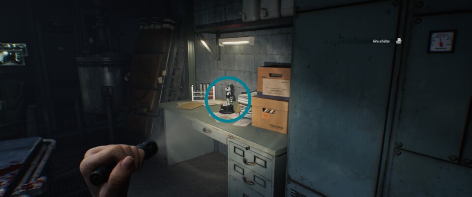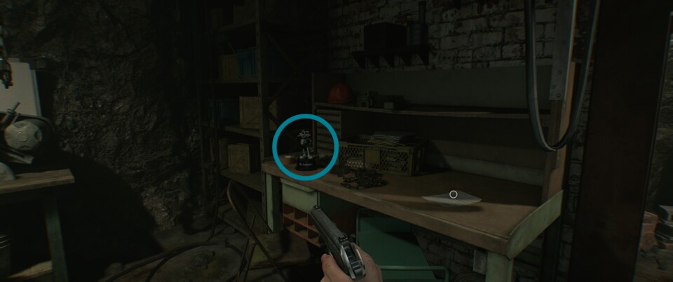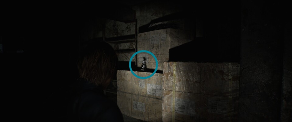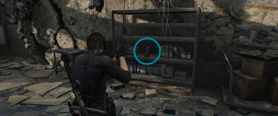 Bevor ihr die Tiefgarage betretet, stoßt ihr auf einen kleinen Vorraum mit Vorräten. Dort steht die Figur auf einigen Kisten.