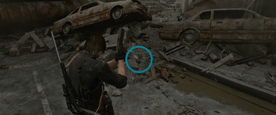 Direkt nach der Motorrad-Sequenz folgt ihr nicht der Gasse. Geht stattdessen nach Westen und der Raccoon steht auf Schutt zwischen zwei Autos.