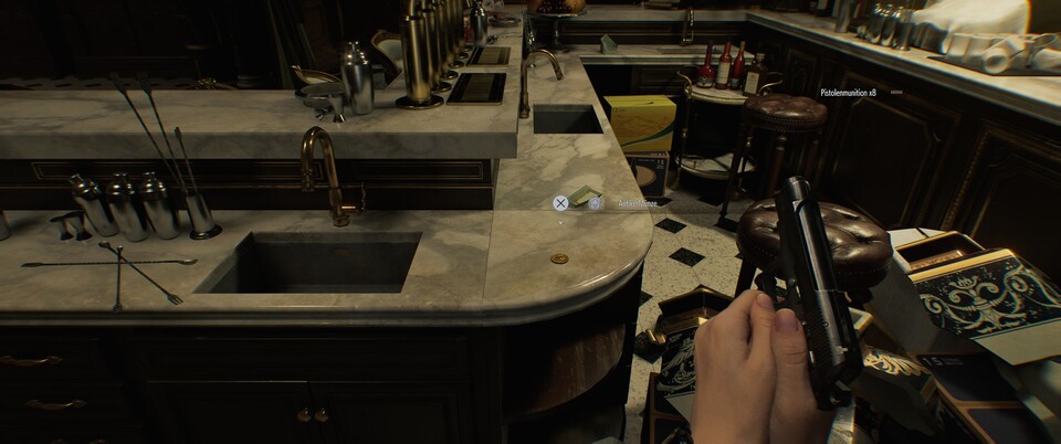 Eine liegt auf dem Spieltisch und zwei weitere hinten auf der Bar.