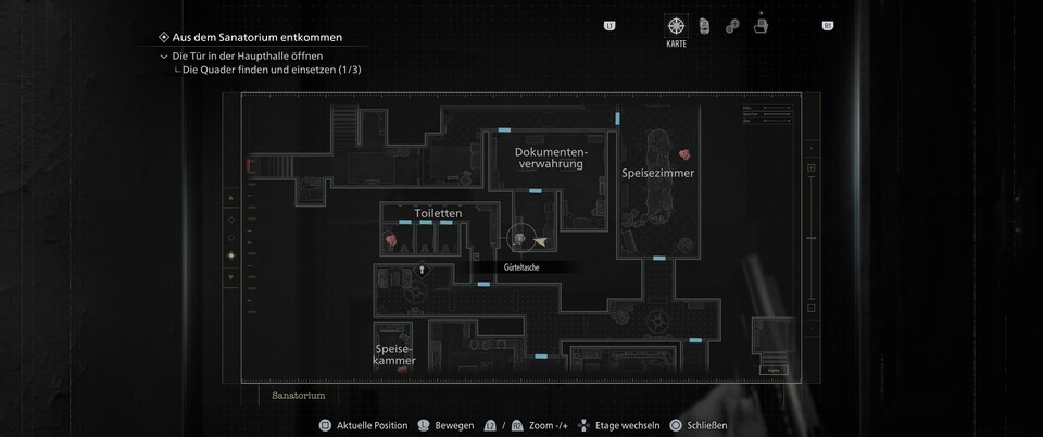 Für die erste Taschenerweiterung müsst ihr euch erst einmal Zugang zum Salon verschaffen. Der liegt noch vor der Küche im Westflügel, aber ihr benötigt den roten Stein dafür.