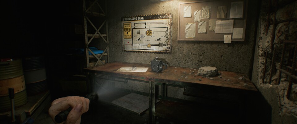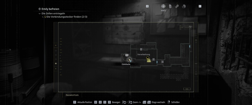 Arbeitet euch bis zur Verarbeitung vor. Hier könnt ihr mit dem Gabelstapler-Schlüssel den Gabelstapler aktivieren, was wiederum den Raum dahinter öffnet, wo ihr auch die Karte des Gebiets findet. Direkt daneben liegt die Tasche.