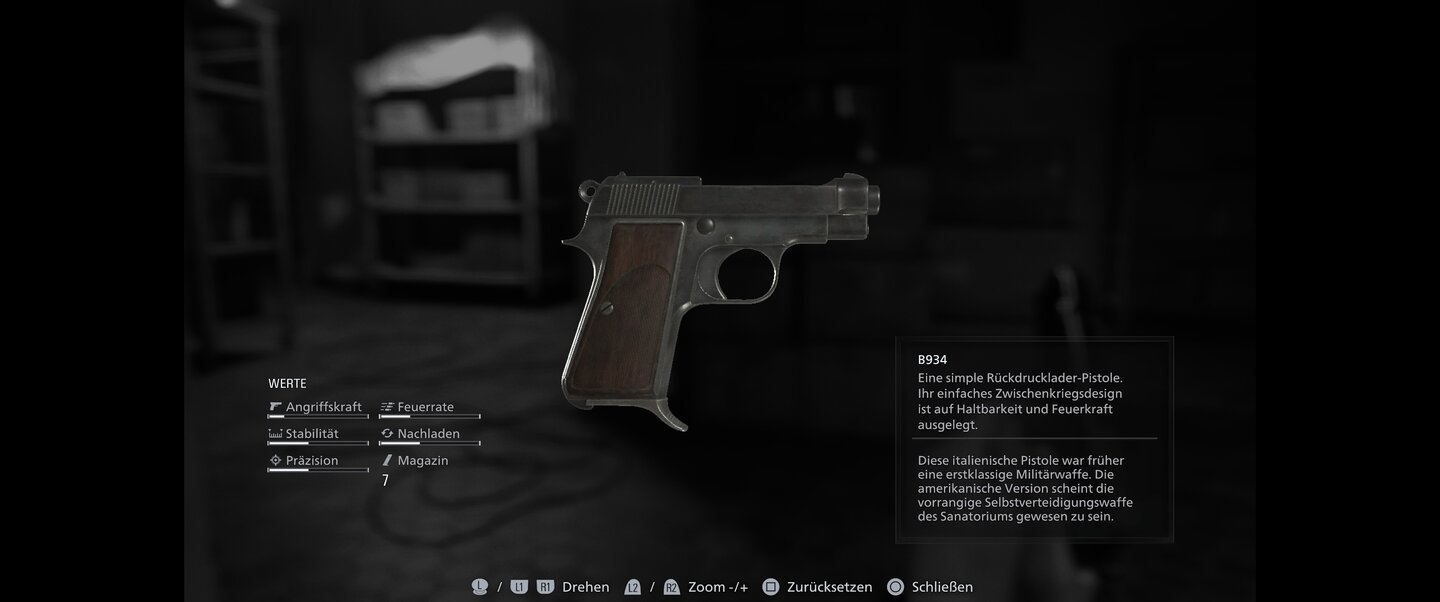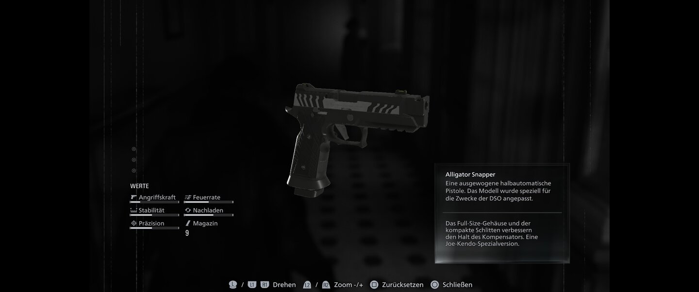 Leons erste Pistole. Sie ist zwar schwächer als die anderen Pistolen, aber ihr schaltet am Ende des Spiels eine Unterlampe frei, so dass ihr sie normal nachladen könnt, wenn ihr eine Taschenlampe nutzt.