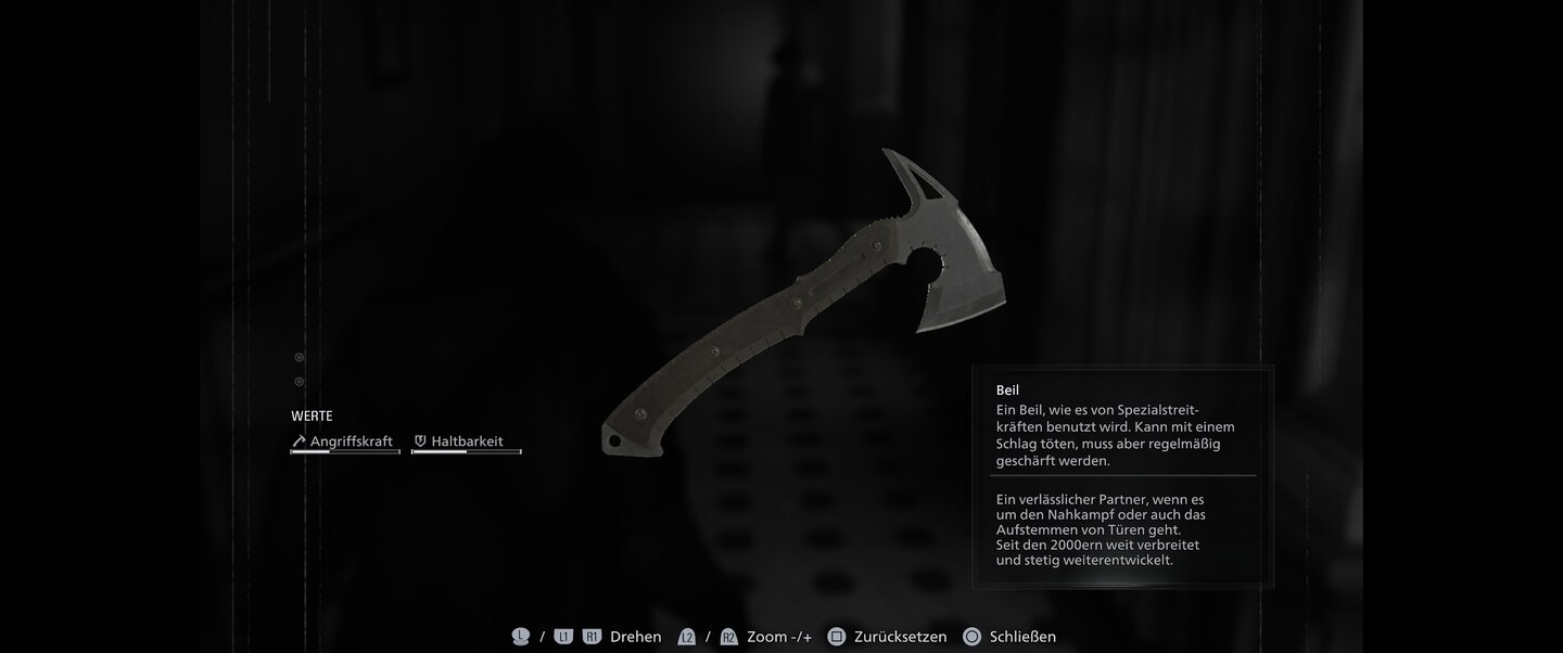 Auch das Beil habt ihr von Anfang an. Es spart euch Munition und ihr könnt Attacken – insbesondere Bosse – parieren.