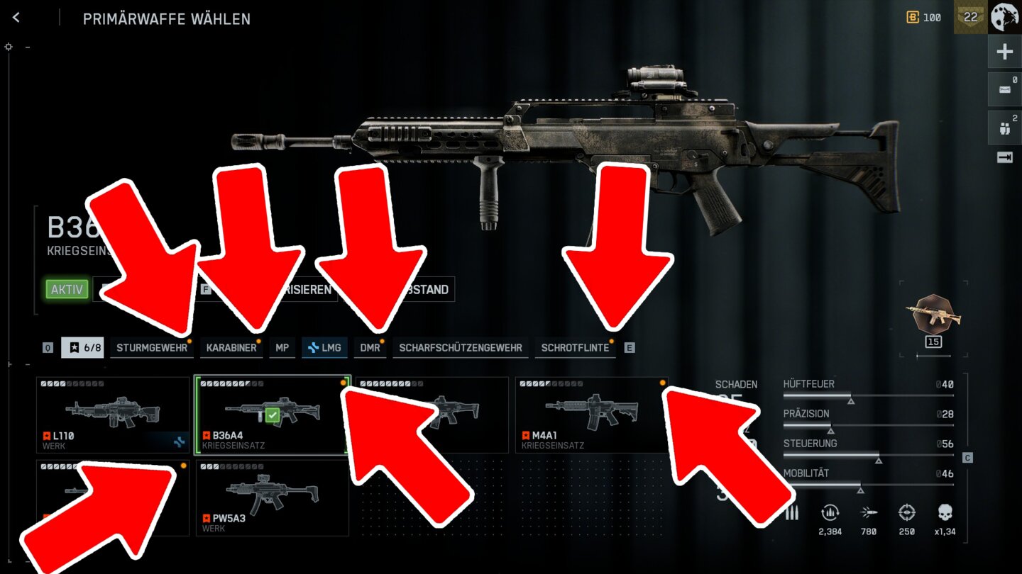Doch die Ruhe hat nicht lange angehalten, denn schon nach der nächsten Session blinkte wieder alles auf, weil ich vier neue Visiere, zwei Läufe und natürlich neue Motive für irgendeine unbedeutende Nebensächlichkeit freigeschaltet hatte.