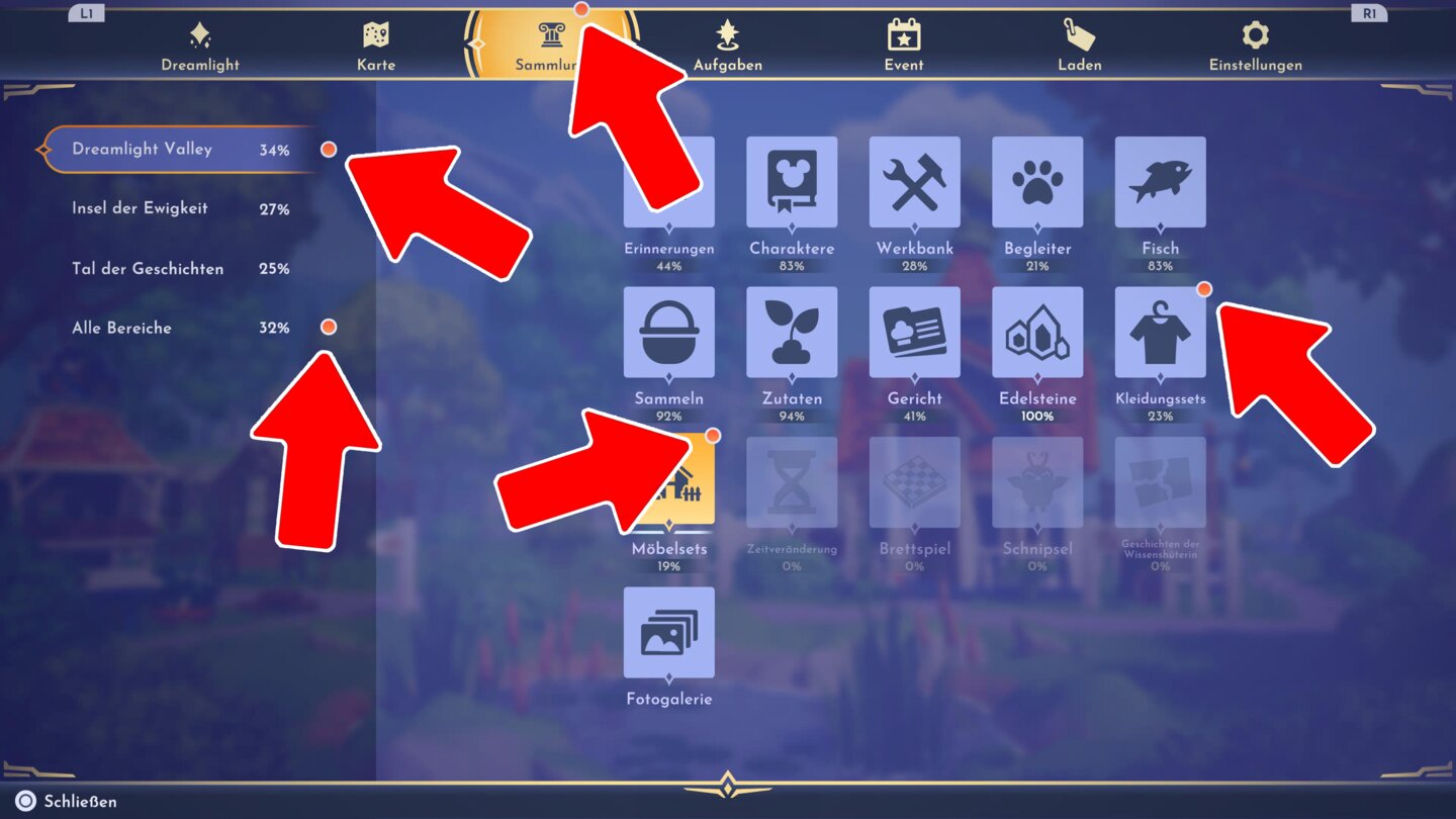Besonders lustig wird es, wenn die Benachrichtigungspunkte dann auch noch verbuggt sind. Eines von vielen Beispiel: Im Cozy-Game Disney Dreamlight Valley blinkt seit Ewigkeiten permanent ein orangener Punkt über meiner “Sammlung” auf, also dem Menü, in dem alle bereits freigeschalteten Items, Charaktere und Zutaten aufgelistet werden.