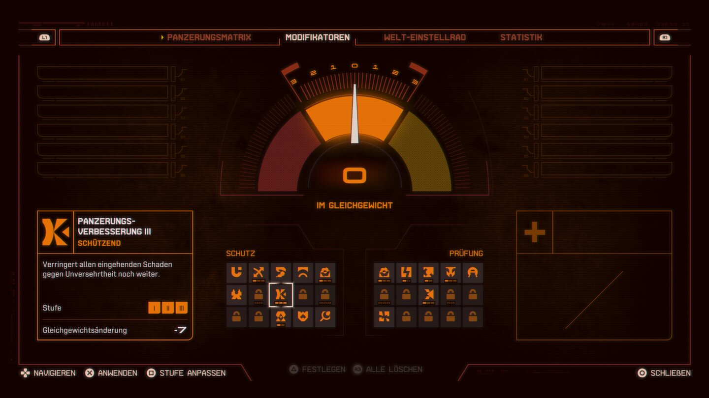 Bevor ihr die Unbegrenzte schützende Modifikatoren aktiviert, könnt ihr es zunächst im regulären Rahmen mit den Mods versuchen. 3 Punkte habt ihr dabei sogar frei, die erste Stufe der Panzerungs-Verbesserung (eingehender Schaden wird reduziert) könnt ihr also auch so ohne Nachteil aktivieren.