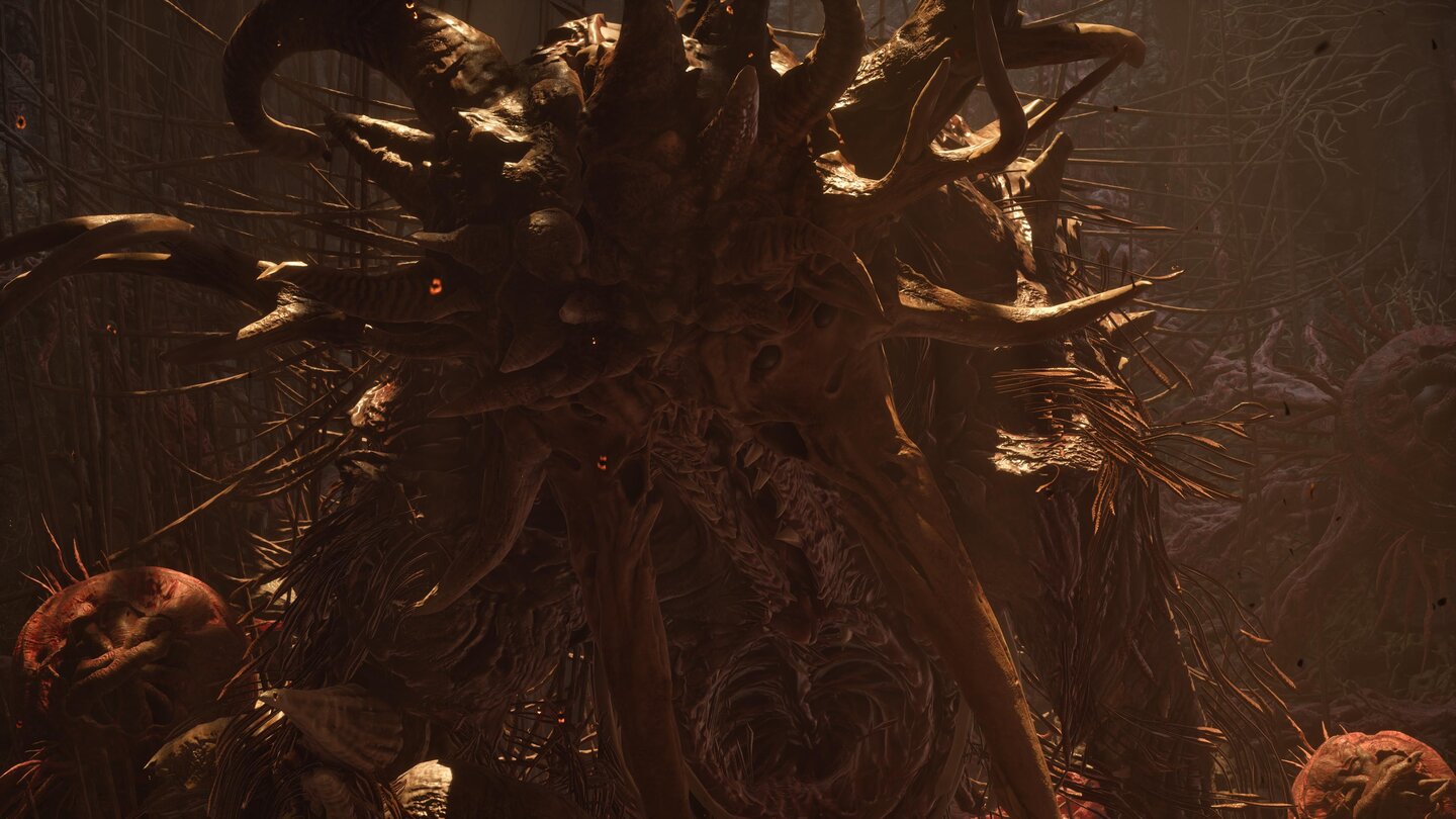 Die Arenen sind dabei stets fair und bieten dank Vertikalität, Sprungpads und fiesen Gegner-Kombinationen bis zum Schluss reichlich Abwechslung. Am Ende eines Gebiets wartet dann noch ein dicker Boss auf mich, der den Weg ins nächste Biom versperrt. Diese Gefechte sind spektakulär inszeniert und ein echter Höhepunkt.