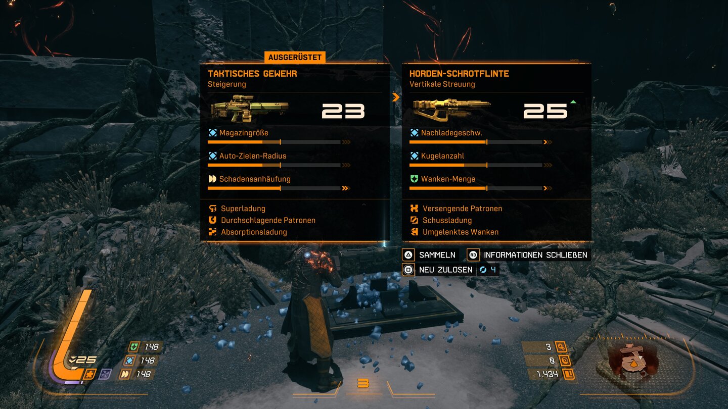 Die Energiewaffen sind extrem mächtig, haben aber keinen unbegrenzten Munitionsvorrat. Für sie brauche ich – ihr ahnt es schon – Energie. Und die ziehe ich aus meinem Schild.