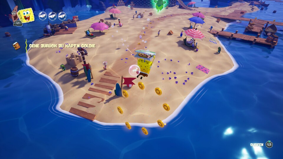 Spongebob und Patrick sind die beiden spielbaren Figuren, die jeweils unterschiedliche Fähigkeiten haben und zwischen denen wir jederzeit mit einem fixen Knopfdruck wechseln können. Eichhörnchen Sandy ist im Gegensatz zum Bikini Bottom-Remake übrigens nicht spielbar.