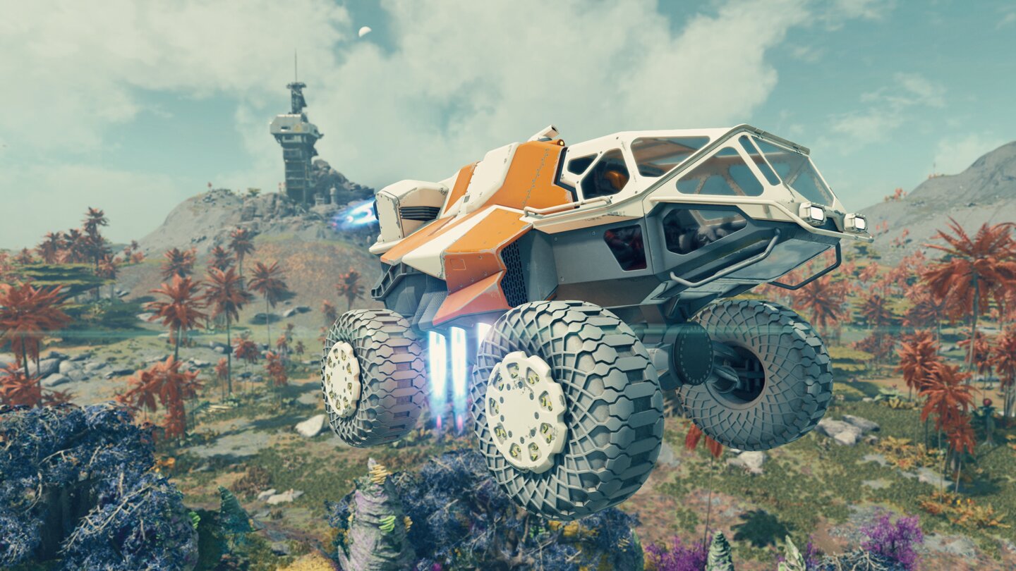Letzteres ist ein weiteres Auto, mit dem ihr über die Planetenoberflächen brettern könnt. Die Besonderheit am Moon Jumper sind Schubdüsen, mit denen ihr euch in die Luft katapultieren dürft. Gepaart mit geringer Schwerelosigkeit, soll es damit quasi möglich sein, zu fliegen.