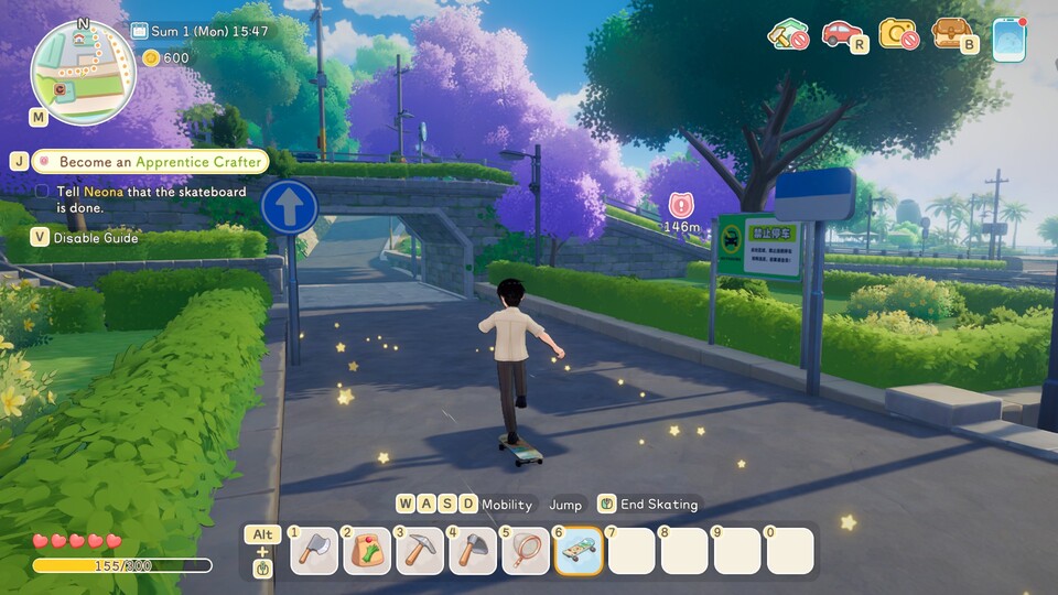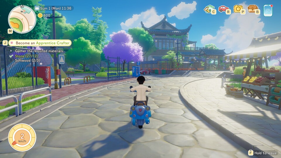 Die idyllische Urlaubsinsel mit einer kleinen Küstenstadt und grünen Wäldern sieht nicht nur schick aus, es macht auch Spaß neue Gebiete zu entdecken. Schon sehr früh bekomme ich etwa die Gelegenheit, Motorroller zu fahren und darf mir in einer der ersten Quests sogar ein Skateboard aus selbst gesammeltem Holz bauen.