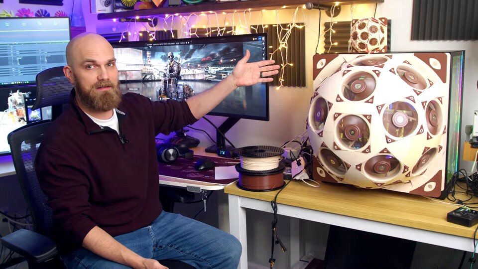 Eigentlich wollte er aus seinem 3D-Drucker nur einen kleinen, sphärischen Noctua-Lüfter mit vielen noch kleineren Lüftern basteln. Das Ganze ist dann aber irgendwie ein bisschen eskaliert, Noctua hat jede Menge Material geliefert und dann kühlt das wahnwitzige Experiment den PC auch noch um 20 Grad Celsius herunter.