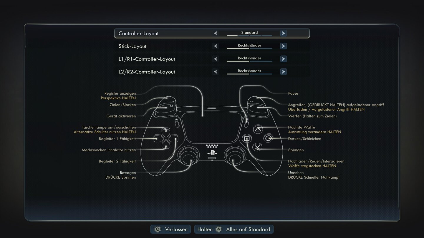 Wir sind mit der "Modern"-Einstellung sehr gut gefahren. Der größte Unterschied ist hier, dass der Inhalator – also sozusagen euer Medipack – mit L1 aktiviert wird, während Granaten mit gedrückter R1-Taste geworfen werden. Damit habt ihr im Kampf alle wichtigen Funktionen auf den hinteren vier Tasten und müsst nur selten zum Steuerkreuz greifen.