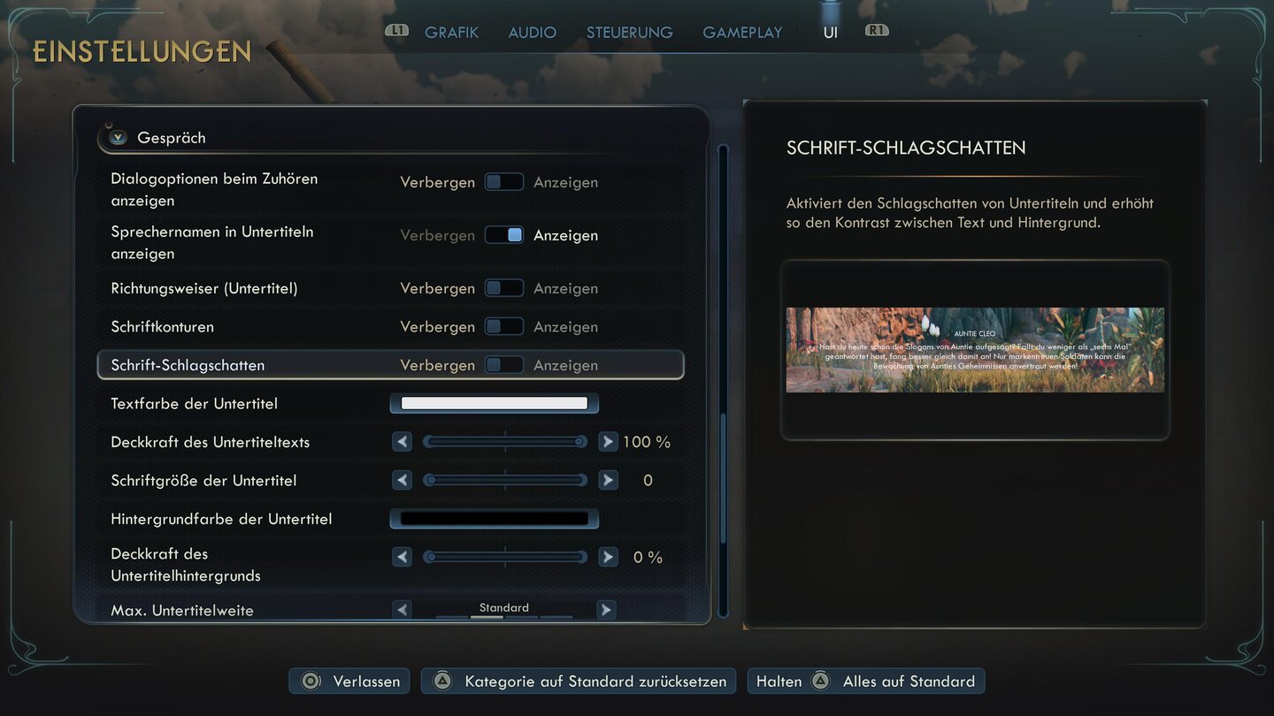 Untertitel: Falls ihr Probleme mit dem Lesen von Untertiteln habt, solltet ihr euch unbedingt in diesem Menü gut umsehen. Ihr könnt etwa Schriftgröße, Farbe, Hintergrund, Kontur und sogar die maximale Breite des Untertitelfeldes anpassen.