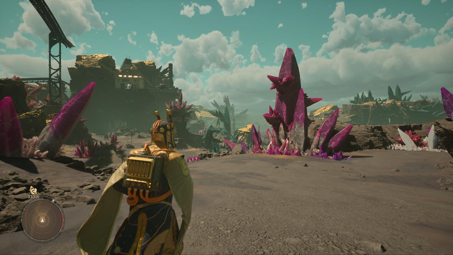 Es gibt stumpfe Fetch- oder Jagd-Quests, aber meistens schafft es das Spiel, mich mit lustigen Dialogen oder emotionalen Schicksalen bei der Stange zu halten. So muss ich etwa eine Feind-Basis möglichst spektakulär ausräuchern, damit die Marketing-Abteilung von Auntie’s Choice ein heroisches Image-Video produzieren kann oder ich finde ein Fort, das offenbar von einem Mantisaurier-Monster angeführt wird, das per Telepathie kommuniziert.