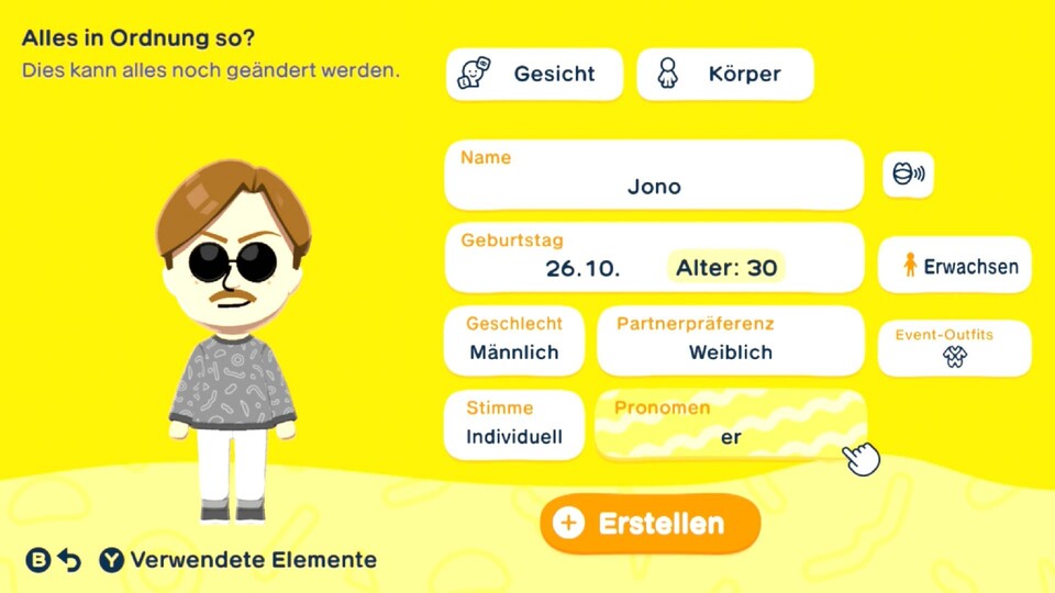 Die Miis, die auf unsere Insel ziehen, müssen wir in den meisten Fällen selbst erstellen. Dabei liegt es natürlich nahe, direkt die ganze Familie, den Freundeskreis und die ein oder andere berühmte Persönlichkeit ins Spiel zu holen. Die Freiheiten beim Erstellen sind groß und mit etwas Aufwand sind die Personen gut wiederzuerkennen. Auch eine Stimme kann gewählt werden, jegliche Gespräche werden nämlich von einem Sprachprogramm vorgelesen.