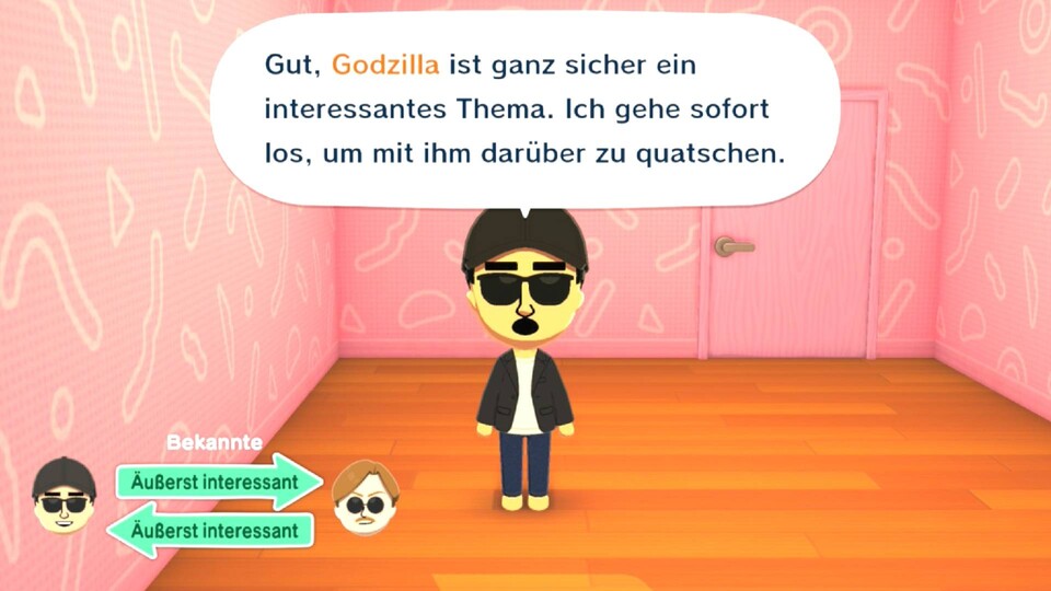 Die Gespräche sind dabei teils extrem witzig, weil die Miis nicht wirklich wissen, was wir da eingeben. Eine Mii-Frau erzählte etwa, dass sie extra auf eine andere Insel gereist sei, um einen der berühmten Auftritte von Godzilla nicht zu verpassen.