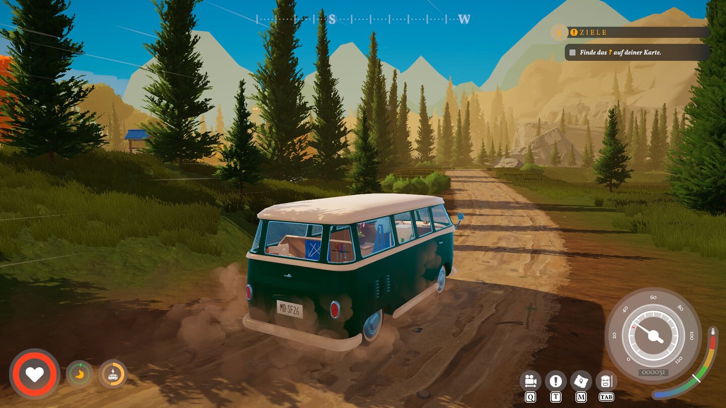 Ihr brecht mit einem alten VW-Bulli auf und fahrt in die Wildnis. Dort erkundet ihr mehrere kleine Open Worlds, baut euer Fahrzeug immer weiter aus und sucht nach den schönsten Plätzen für die nächste Übernachtung. Dabei spielen auch seichte Survival-Features eine Rolle.